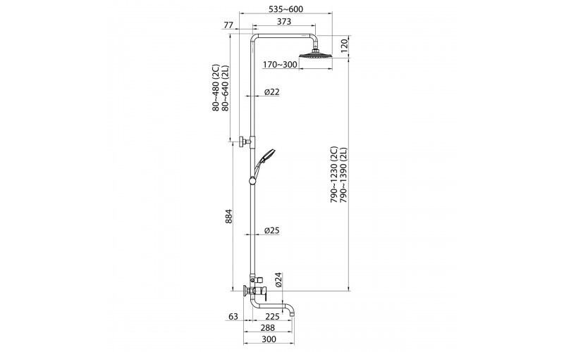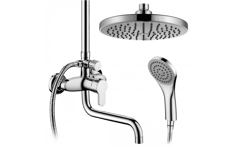 | Оснащение | Смеситель, верхний(тропический) душ ABS- d=200 мм, ручной душ-пластик-d=85 мм релинг-раздвижной, шланг-металлический 150 см. Трехпозиционный переключатель на душ. |