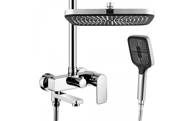 | Оснащение | Смеситель, верхняя( тропическая) лейка ABS d=315*210 мм, релинг-раздвижной, ручной душ- пластик, шланг-металлический 150 см. Встроенный в излив переключатель на душевую лейку. |